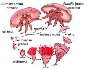 Aurelia sp.Aurelia memiliki medusa yang memiliki diameter antara 7-10mm dan mengalami siklus hidup seksual(medusa) dan aseksual(polip). Proses reproduksinya adalah sebagai berikut: